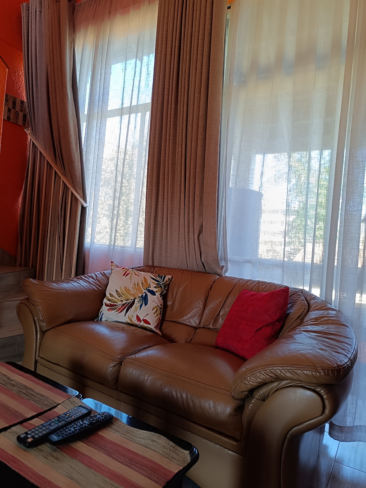 Lovely 2 bedroomed serviced apartment with a private garden, enclosed verandah, spacious lounge, modern kitchen with gas and electric hobs, washing machine, fridge, toaster, electric kettle, hot water, back up water and power in a secure complex. Guests have access to uncapped Wifi and satelite TV. The bedrooms are equipped with a king and queen bed respectively