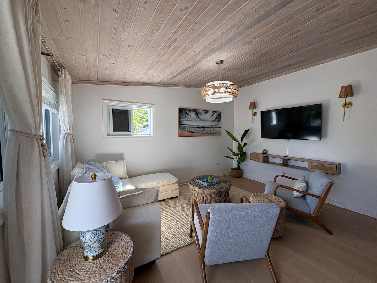 Pirates Den is the main house at Three little Birds. It is a spacious layout with full kitchen plus an outdoor kitchen, vaulted living room, office, king bedroom & office plus a laundry room. It's a short walk to the beach & next to Romora Bay Club & Marina offering live music, bar and restaurants and great sunsets. There are two additional semi-detached rear studio suites with their own entrances that can be rented with the house or independently. The crow’s nest temporary not available.