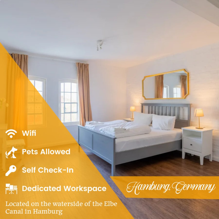 Come to our luxurious 3-room apartment in Hamburg, located directly on the water. Enjoy the natural light, WiFi and a dedicated workspace. Cook in the fully equipped kitchen and relax in the living room. Washing machine and dryer are available. Self check-in is possible. The main train station is only 15 minutes away with a bus station right around the corner to take you there. Book now and experience luxurious living in Hamburg!