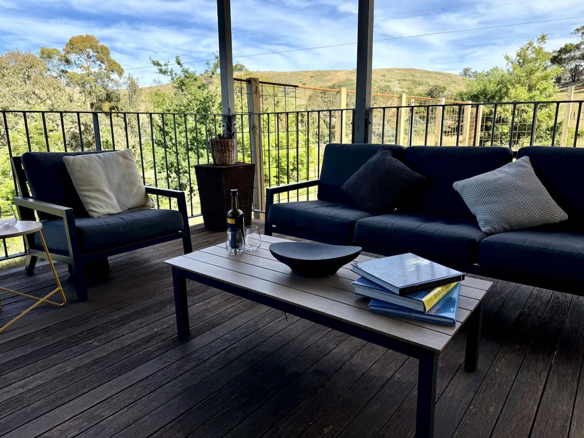 This self-contained studio on Dja Dja Wurrung Country is tucked below our house. It's a totally separate and private space, air conditioned, double glazed and with its own off-street parking and access. It is within walking distance to the town centre, The Mill Complex, The Bridge Hotel and the Botanic Gardens; and just a 7 min walk up the hill from the railway station. Enjoy fabulous views to the east from the lounge, bedroom and your private balcony across the town to Leanganook.
