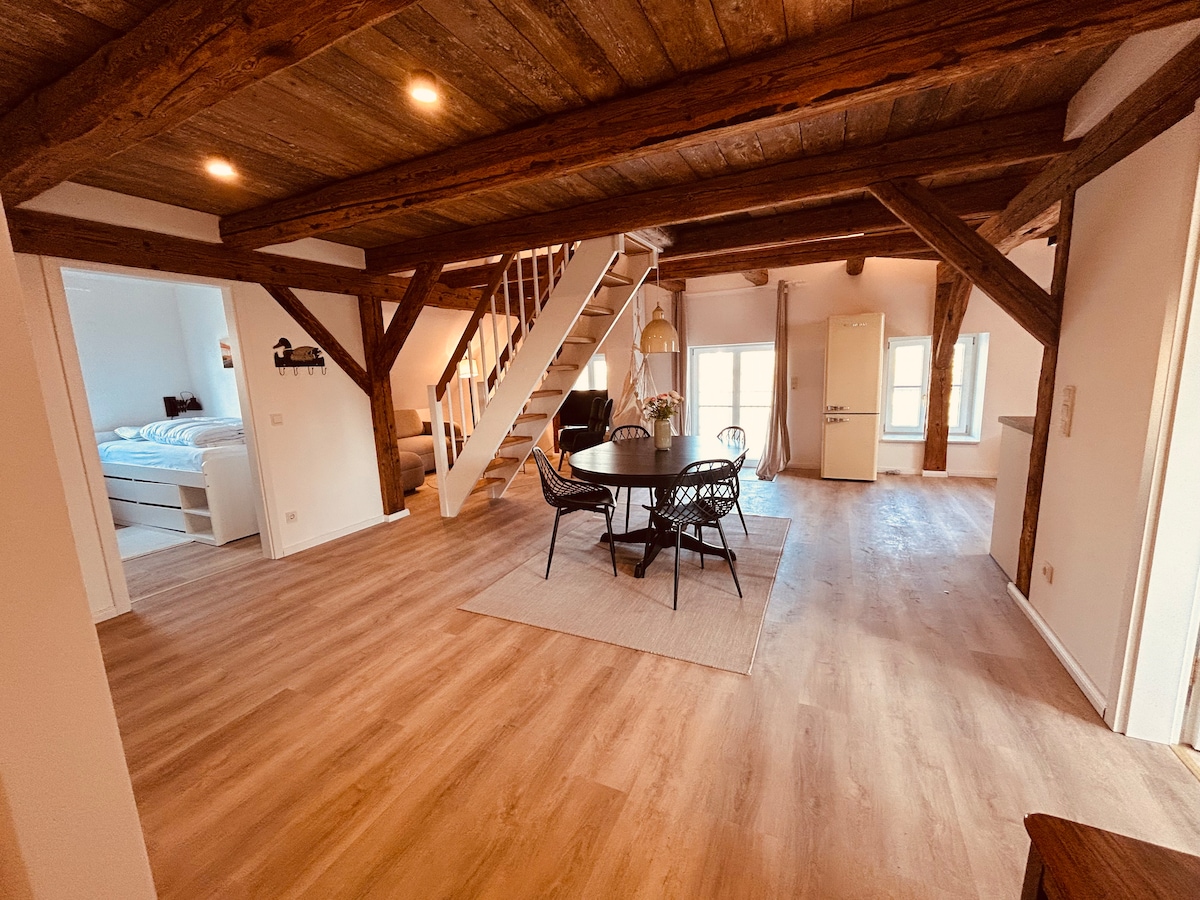 Sie ist 40 m² groß und liegt in einem 2-Familienhaus am Ortsrand von Lenglern. Auf der oberen Ebene befinden sich Eingang, das Schlafzimmer und Bad. Eine Wendeltreppe führt vom Schlafzimmer direkt nach unten in den Wohnbereich mit kleiner Küche. Davor liegt die kleine Terrasse. Öffentlicher Parkraum direkt vor dem Haus. Öffentliche Verkehrsanbindung nach Göttingen über Busse und Bahnen (in 9 Minuten ist der Zug am Göttinger Bahnhof)