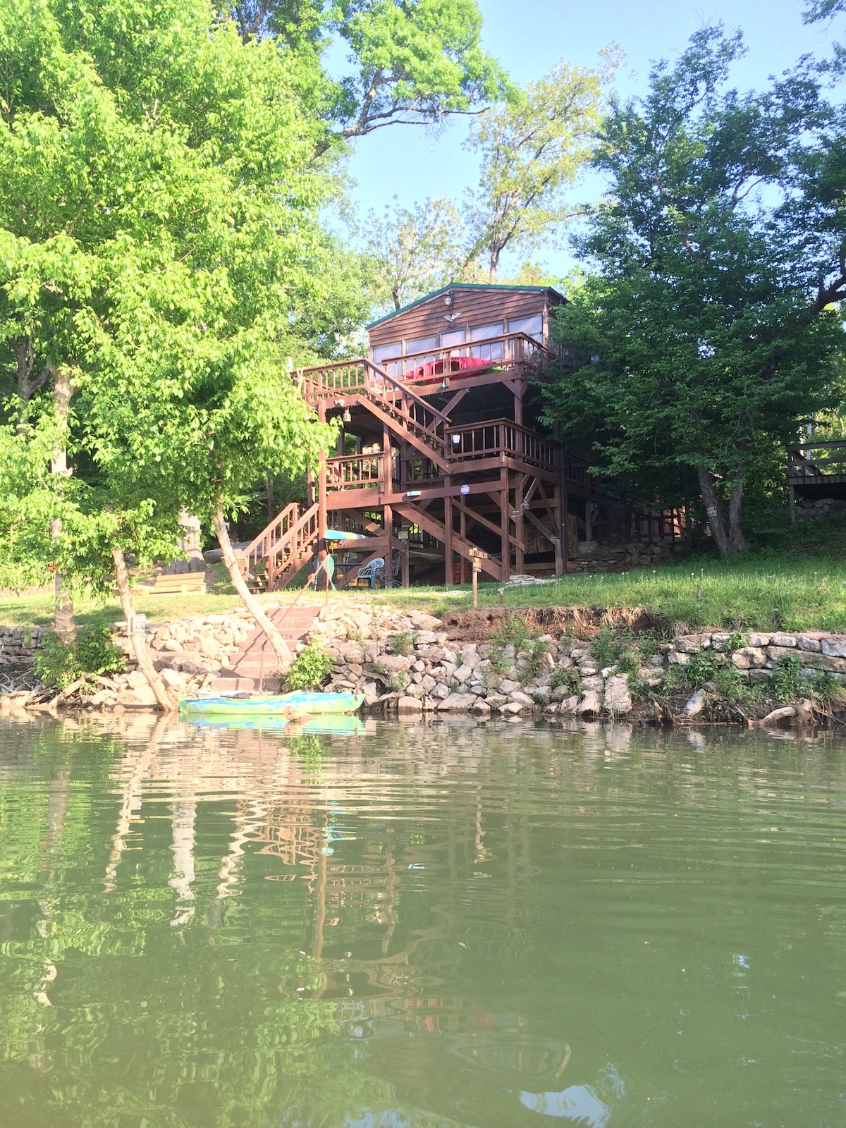 Take it easy at this tranquil cabin getaway directly on the Spring River; ideal for trout/bass fishing, kayaking/tubing and relaxing. Indulge in the comfort of this off the beaten path retreat. Spacious back deck overlooking the water. Enjoy listening to the sounds of the river around the fire pit that comes stocked with complimentary wood, or show off your skills on the top deck with a charcoal grill!