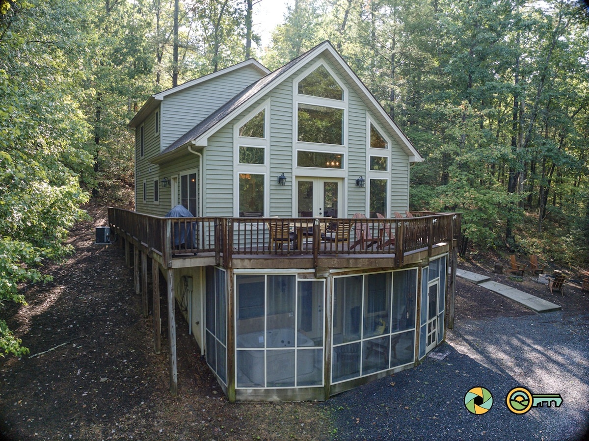 Moonshine Mountain is a modern mountain chalet built in the traditional style. The great room’s wood cathedral ceiling, wall of windows and large deck invites the outdoors inside for a feeling of tree house living. Enjoy the hot tub on the lower screened-in patio! Located within the Bryce Resort mountain community, it's a short 2.5 mile drive to the Resort's main lodge and ski/bike lifts, and a 4 mile drive to the Basye Community Store.