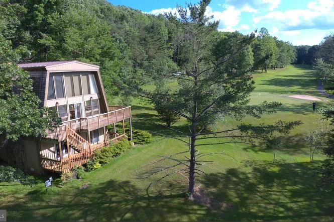 Overlooking the golf course at Bryce Resort, this stunning retreat offers breathtaking views year round from all three levels. Thoughtfully designed for relaxation and entertaining, the home features two outdoor decks and a custom terrace that partially wraps around the property, creating the perfect space to entertain, or relax after a day at the resort. This well-maintained home has seen several recent updates. Living room complete w/ wood burning fireplace. Bring the whole family to enjoy