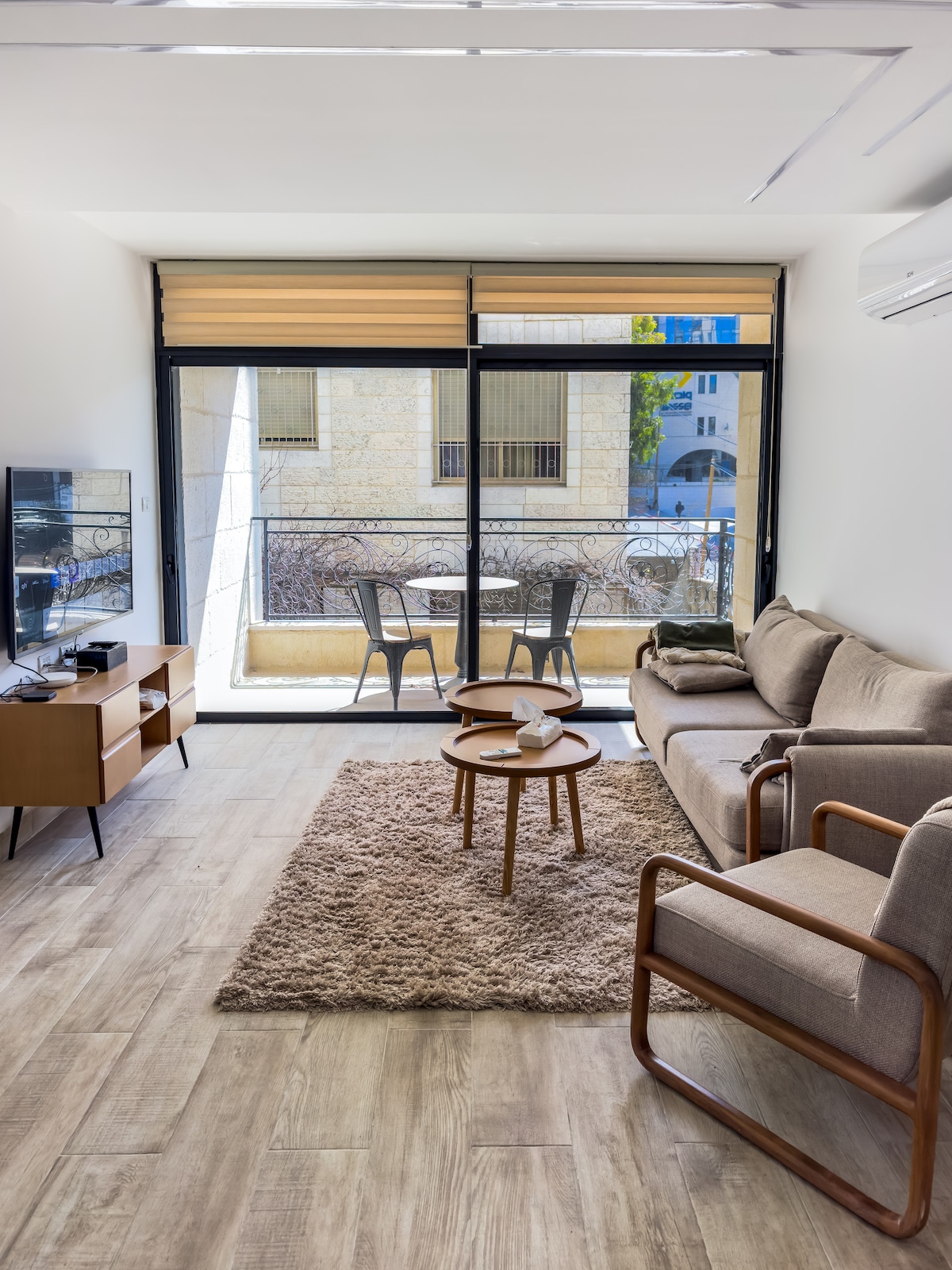 Enjoy Jerusalem in this centrally located, newly renovated, modern, stylish, & spacious 2 Bed-2 Bath Apartment, w/ a garden. 2 minute walk away is trendy Emek Refaim St. and the new railway station which is filled with chic cafes, upscale eateries, and artisan boutiques. Surrounded by trees & green space. Easy parking and transport nearby.