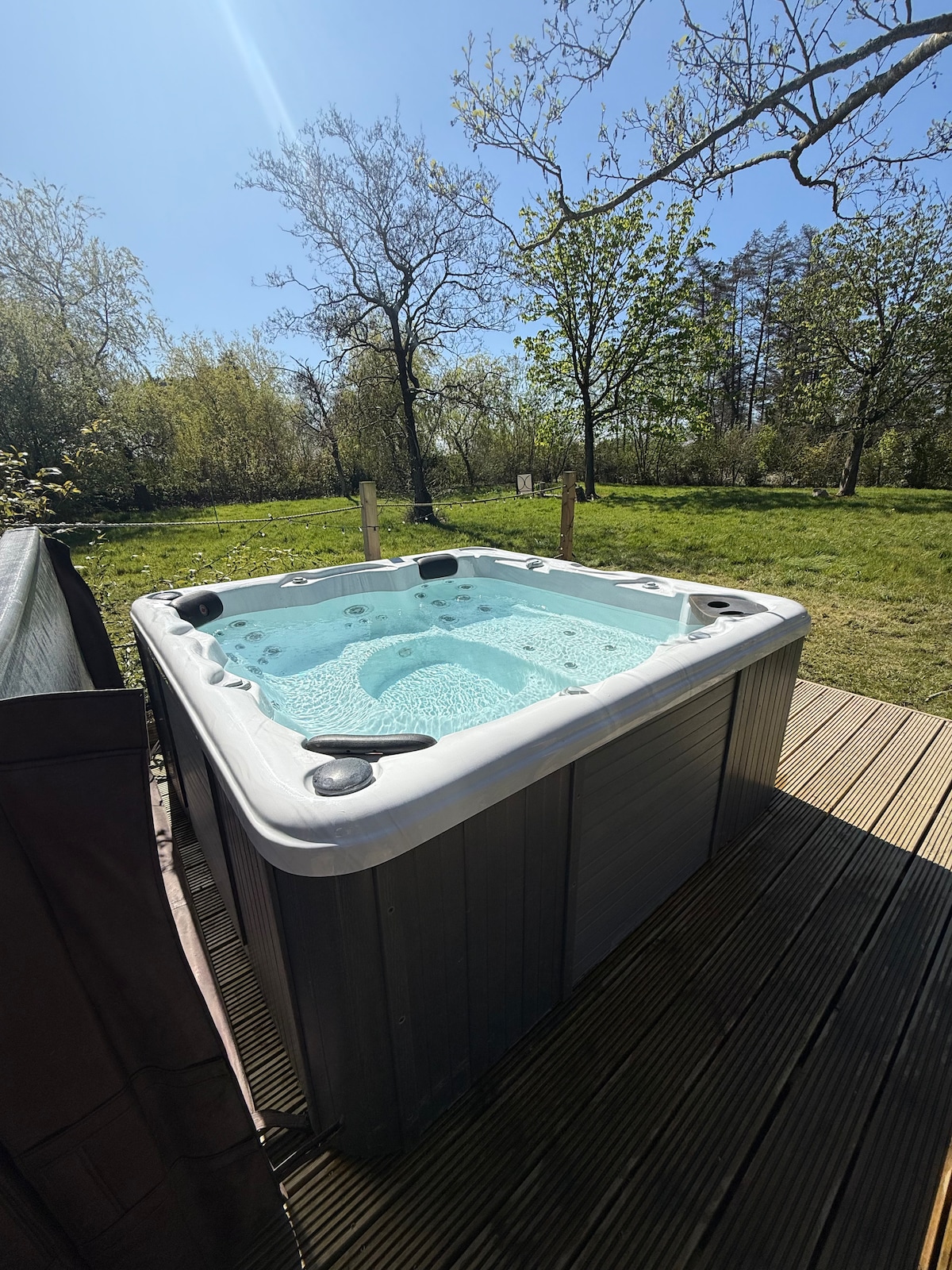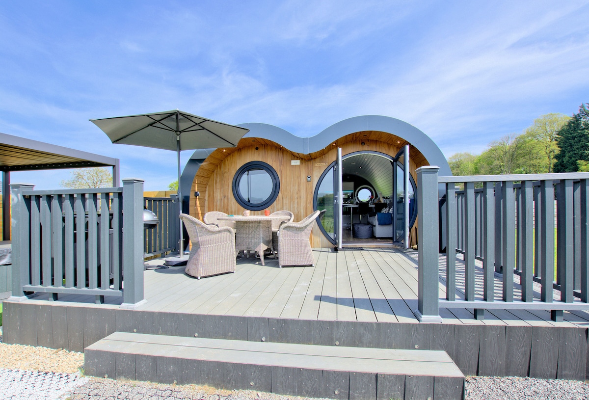 A luxury retreat for one or two. This bespoke, environmentally friendly Escape Pod, handcrafted in the north of England, offers a truly unique accommodation experience. Suitable for all seasons with log burner and bifold doors to bring the outside in. Set within our wider family farm retreat — neighbourly but never overlooked. A large secure glass-fronted decking area with hot tub for two and BBQ to relax and enjoy the privacy and tranquillity of our rural site.