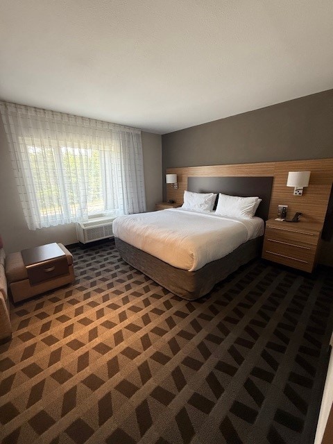 Get cozy in your private room with fresh linens, clean shower, Dove amenities, and more! Room includes private bathroom, in-room fridge, microwave, and Keurig coffee maker. We offer an on-site full bar and restaurant that serves freshly made breakfast in the morning and tasty dinner in the evening! Our additional amenities include fitness center, guest laundry, courtyard, indoor pool, and convenience store plus free ample parking.