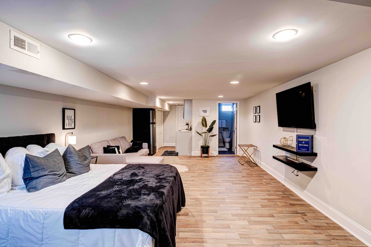 - 5 miles from Inner Harbor, Orioles and Ravens Stadiums, Johns Hopkins Hospital, Fells Point - Free off-street parking in charming safe well-lit neighborhood - Fastest WiFi and Laptop friendly - Pets must be preapproved. Do not book without contacting host - “5-star experience, just like home” Totally private suite including bedroom, bathroom, kitchenette and den, in a quiet, safe neighborhood in B’more’s quaint upper East side. Feel right at home in this friendly and inclusive space