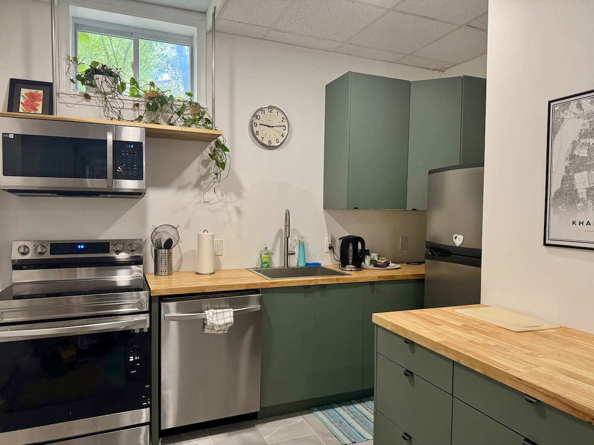 This is a spacious lower level of a newly built home. This private guest area has a lounge, dinning, and kitchenette in addition to a bedroom and a bathroom. Guests share only the main entrance of the townhouse with owners who live upstairs. This private decorated space includes a smart TV, comfortable seating, dining for 4, microwave, coffee maker, full refrigerator, toaster/air fryer, queen bed, wardrobe & dresser. Washer/dryer available upon request. Please review house rules before booking