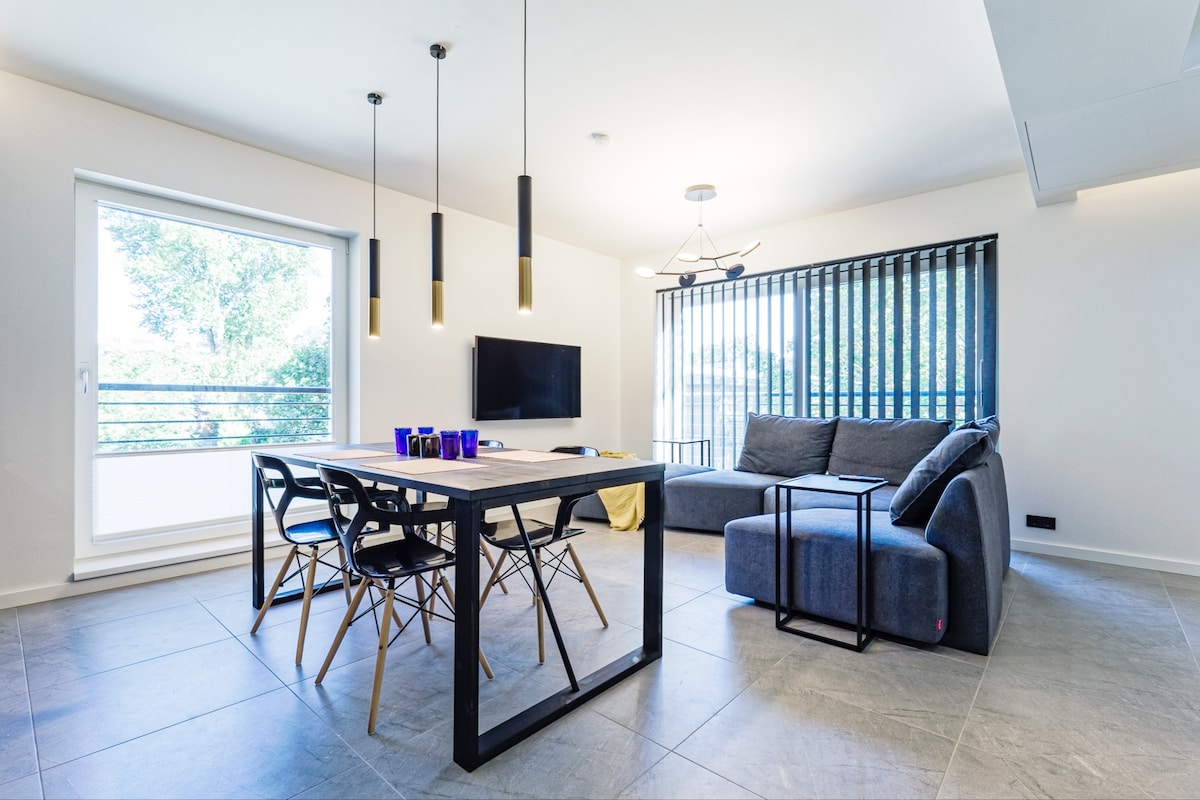 • 1 bedroom apartment • 180 cm-wide king bed • Additional sofa bed • Sleeps 4 people • Balcony • Climate-neutral & double carbon offset • 47-55 m2 • Kitchen • Air ventilation with cooling • Shared laundry facilities • Regular professional cleaning • Local gym access included • Yoga mats & online yoga studio access included • Contactless access • Early check-in & late check-out (on request) • Fast WiFi • Smart TV • Free luggage storage • Baby crib available
