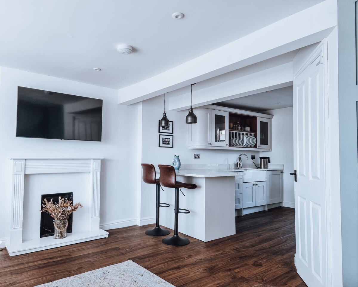 'THE VIEW' is a stunningly located contemporary FIRST FLOOR apartment! We can sleep 4 or even 8 guests if booked together with our no. 2 ‘THE VIEW’ on the ground floor! Lounge back on the sofa, and gaze out on to the whole of Anglesey and all the way down the famous waters of the Menai Straits. Just minutes from the A55 it’s the perfect hub to explore the wonders of both Anglesey and Snowdonia 'THE VIEW' is your perfect dream get away from the hustle and bustle of modern life and relax!