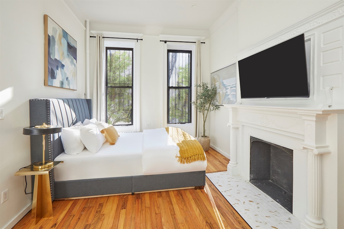 Welcome to Vintage Luxe, a stunning 1894 landmark in Sugar Hill restored into a luxurious boutique! This charming unit includes an accent fireplace, bay windows, a king bed, high-speed WiFi, a dedicated workstation, and a fully equipped kitchen. Step outside to your private patio—a rare NYC luxury. With a prime location just 1 minute from the metro and close to Yankee Stadium, this space is perfect for couples, families, or groups seeking a central and elegant stay.