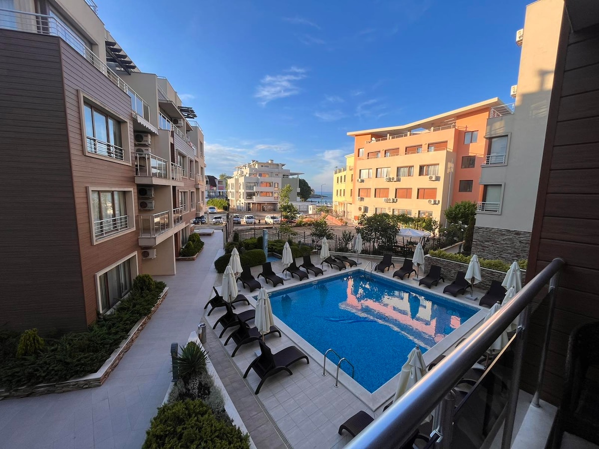 Welcome to our modern, fully equipped one-bedroom apartment, located just 250 meters from Harmani Beach in a peaceful and quiet area of Sozopol. Situated in a charming complex with a swimming pool, the apartment offers the perfect combination of comfort and convenience Enjoy your morning coffee or evening wine on one of the two private balconies with calm views of the Strandzha mountains. The apartment also comes with a private, numbered parking space for your convenience.