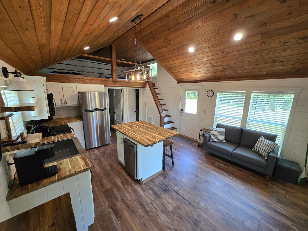 This one of a kind custom cabin is the definition of glamping. Enjoy the sights and sounds of nature while enjoying all the comforts of home. The home is brand new and sits on 10 acres of private land. Less than 20 minutes from Raven Rock State Park, Campbell University and other outdoor adventures. Amenities include a private fire pit, gas grill, and walking trails.