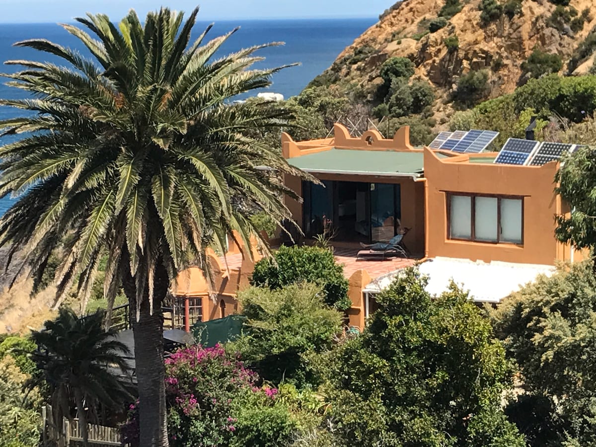 A magnificent historical home surrounded by fynbos, overlooking False Bay with stunning sea views and an imposing mountain backdrop. The villa is located in a nature conservancy. It is completely off the grid: solar energy, water from a mountain stream. This place is for people who want beauty and tranquillity and a getaway experience in a 100% environmentally friendly place right on the urban edge - 8kms from Simonstown. Fully equipped open plan kitchen, exquisite bedrooms and awesome decks.