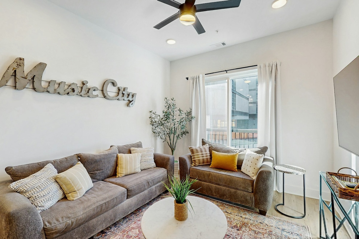 *CONTACT HOST for our current specials* We designed this beautiful penthouse apartment with art, elegance and comfort in mind. You'll love having everything you need for a wonderful stay: a resort-style heated pool, courtyard, top-floor sky lounge, two-story gym & rock climbing wall, multi-level "library" gathering space, and PERFECT LOCATION! Walk 1 blk to Music City Center and Hall of Fame and only 2 blks to Broadway. Whether traveling for business or pleasure, this is your place!