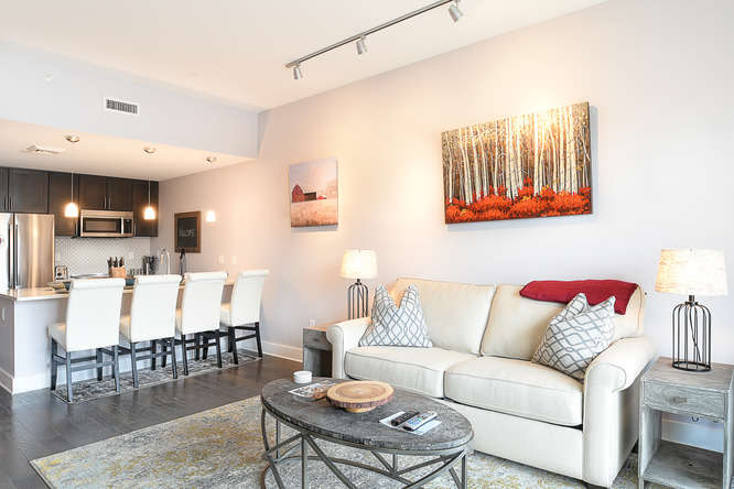 MASTER KING BED & KING PULL-OUT / 1 AND 1/2 BATH / 877 SQUARE FEET / SLEEPS 4 Residence 202 is a modern appointed home that sleeps four and allows you to comfortably engage the urban excitement Asheville offers. For added convenience and safety, private parking in the building is available. The residence is furnished in a contemporary style with a kitchen and bath fully-equipped for your personal and entertainment needs.
