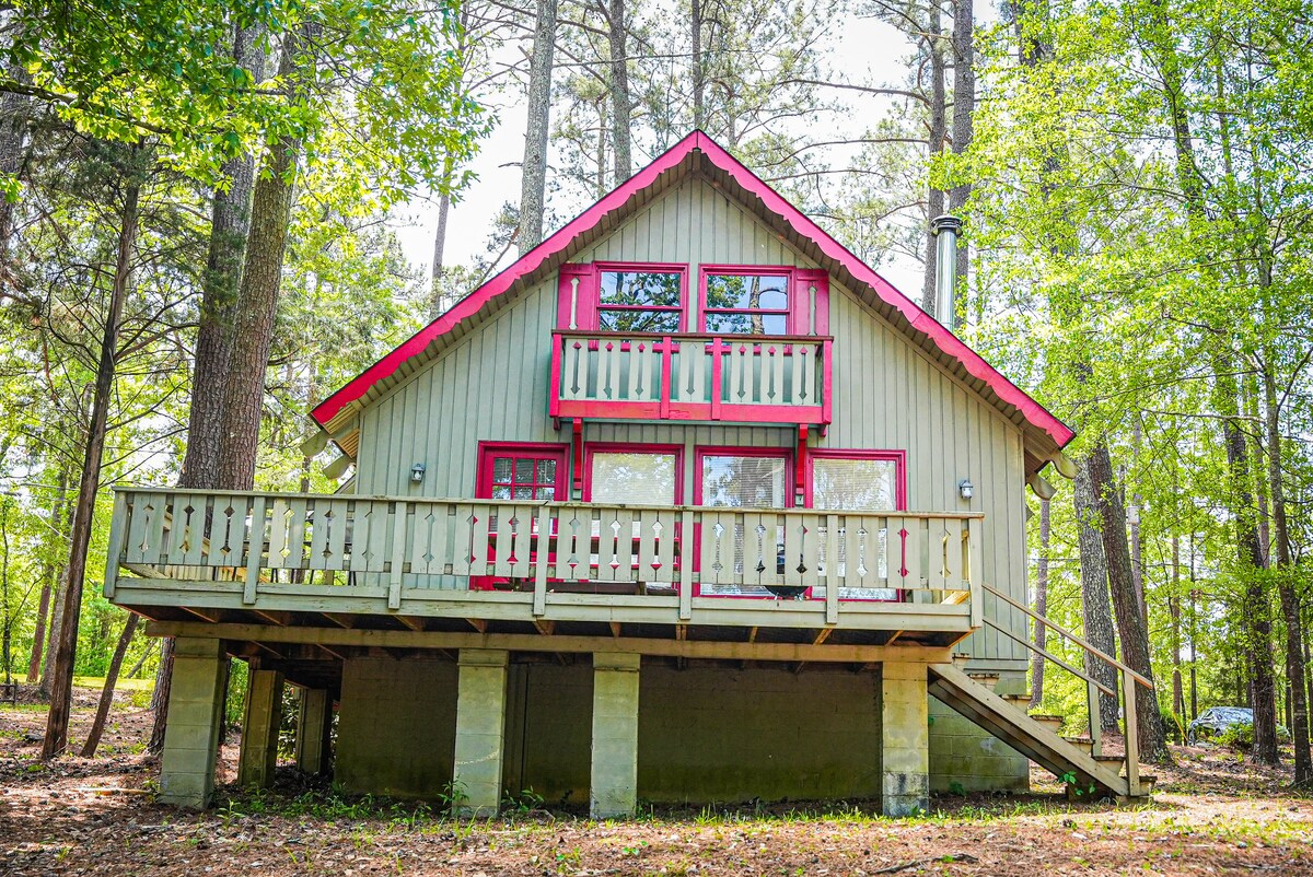 This A Frame was built in the early 70s. Enjoy a fully equipped kitchen, a deck, an outdoor patio, two living areas, and more. Enjoy the peaceful neighborhood and surroundings. Walking distance to downtown Pine Mountain and a few minutes walking or biking to Callaway Gardens. Nearby attractions include several wineries and breweries, FDR national park, the Wild Animal Safari, and more. This is an old rustic house. If you leave the doors open, bugs may come in as we are in the woods.