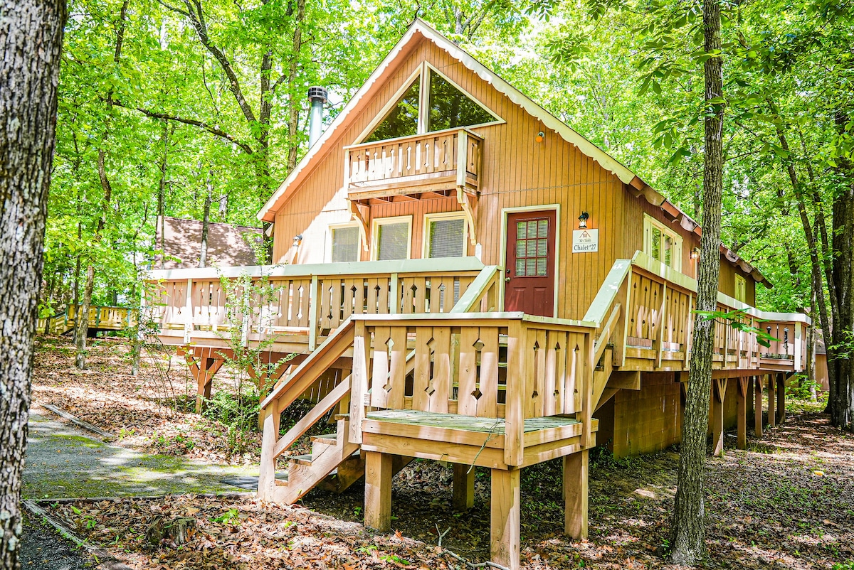 Must be 25 years of age. PMCC cannot accommodate local reservations. Chalet #14 is a three bedroom chalet with a lovely wooded view. This chalet has an open floor plan with a furnished kitchen, living room with fireplace,dining area and even a charcoal grill on the deck. It has two double beds upstairs in the loft and a queen bed and king bed in the bedrooms downstairs. Not Pet Friendly. A card must be on file for each reservation, we also must collect information that Airbnb does not send to us