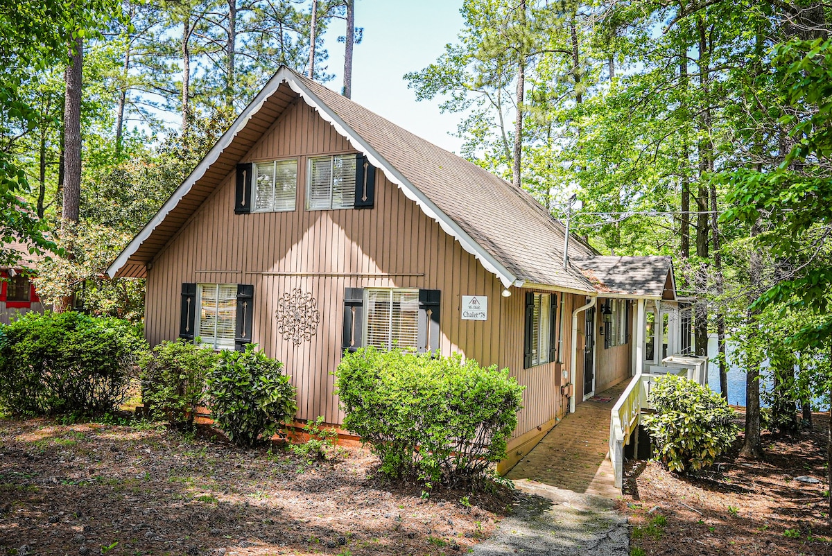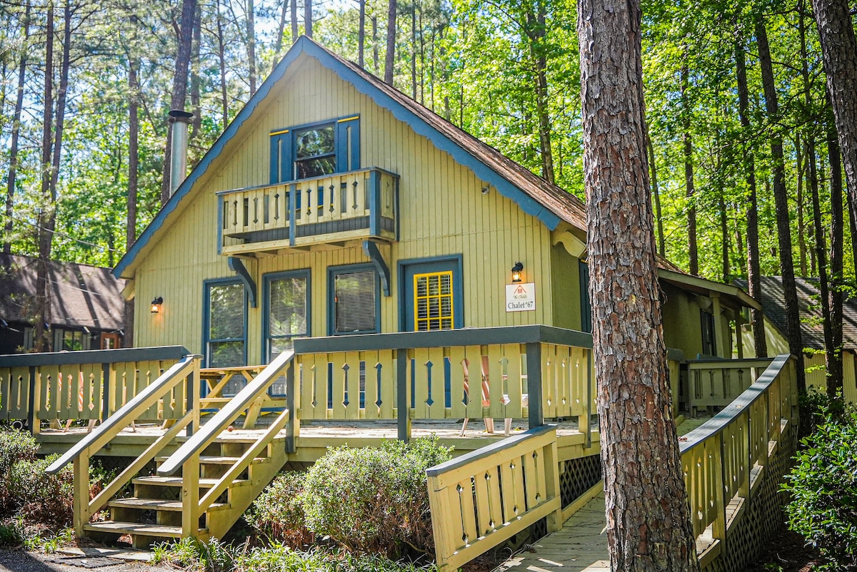 This cabin is located in the Pine Mountain Club Chalets Resort, a 65-acre property less than one hour from Atlanta in the foothills of the Appalachian Mountains. Chalet 21 has 2 bedrooms downstairs and one in the above balcony room with bath. The property has a 12-acre fishing pond (bring your own life jackets), playground, beautiful seasonal swimming pool, tennis courts, sand volleyball, 9 hole putt putt course, ping pong in recreational facility. We'd be delighted to have you as our guest!