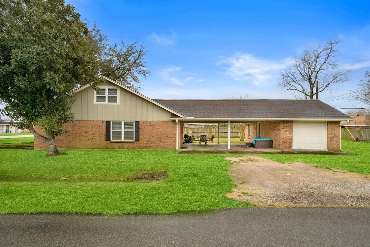 Private Home Sleeps 9 in this newly remodeled 4 bedroom 2 bath Home Away From with Hardwood floors Granite Counters Laundry room included Home Super Host 5 star in Deer Park TX with 3 King Size Beds, One queen and a couch Game room with Pacman Arcade and Covered Back Patio and High Speed internet wifi smart tv's in every room Private Back yard, Culdesac Street Beautiful 100 year old Oak tree to sit under at night