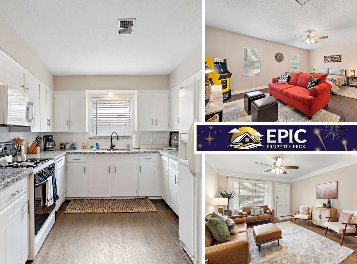 ✨ Newly Remodeled Pasadena Gem! ✨ Spacious 4-bed, 2-bath home sleeps 10 with modern vinyl plank floors & sleek quartz countertops. Game room fun awaits with a classic Pacman arcade! Sleep like royalty with 2 king beds, 1 queen, plus 2 sleeper sofas. Stay connected with high-speed WiFi and smart TVs in every room. Relax on the covered patio or in the private backyard. Perfect for families or groups—5-star rated by a Superhost! Book your stay now!