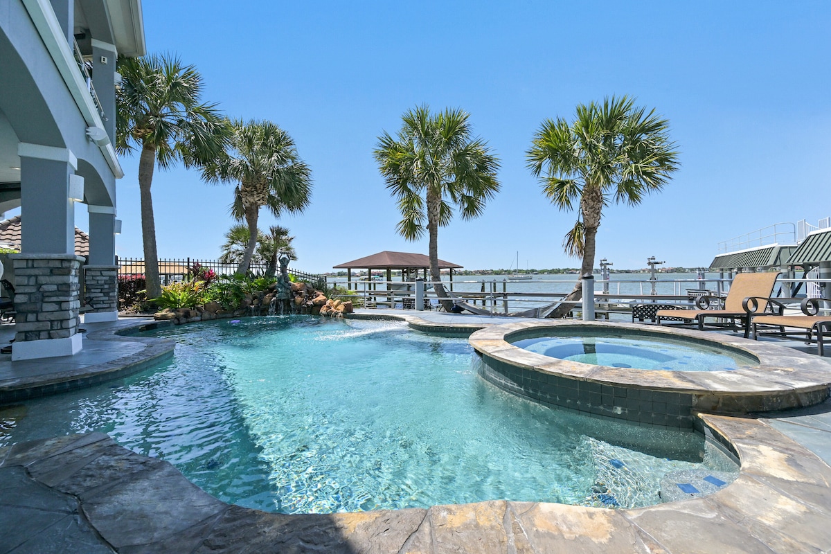 Authentic Starlight Diner Converted to a Bayside Bungalow on Galveston Bay! This Charming and Unique Waterfront Property has Panoramic views of Galveston Bay from Kemah to Red Fish Island. The deck has comfy sectional/chairs, gas firepit, Weber gas grill. Two Bathrooms and Huge Master Shower, Two Bedrooms with darkening curtains. The Yard with Heated Pool/Hot Tub, fenced in yard, patio table, chairs and umbrella. One block to Noah's Ark Restaurant, Pier and Public Boat