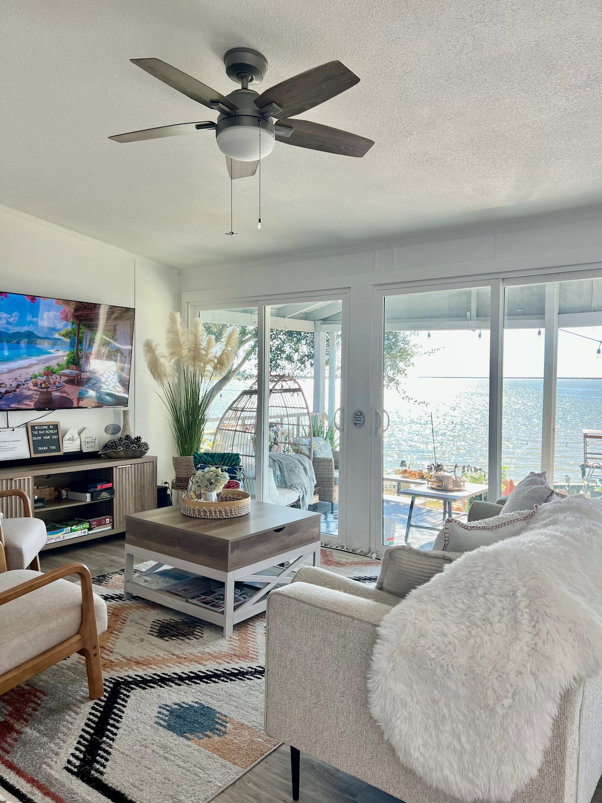 Relaxing waterfront home with the best sunsets on Lake Houston. Updated, modern rustic home with open living and oversized deck, perfect for quality time with family or friends. Fully stocked kitchen with SS appliances, ice maker, drink cooler, wine fridge, and oversized kitchen island. Fish or swim off the long dock with stairs into water, and rinse off in the outdoor shower. SmartTVs provided in all bedrooms and living room with surround sound speakers in indoor and outdoor living spaces.