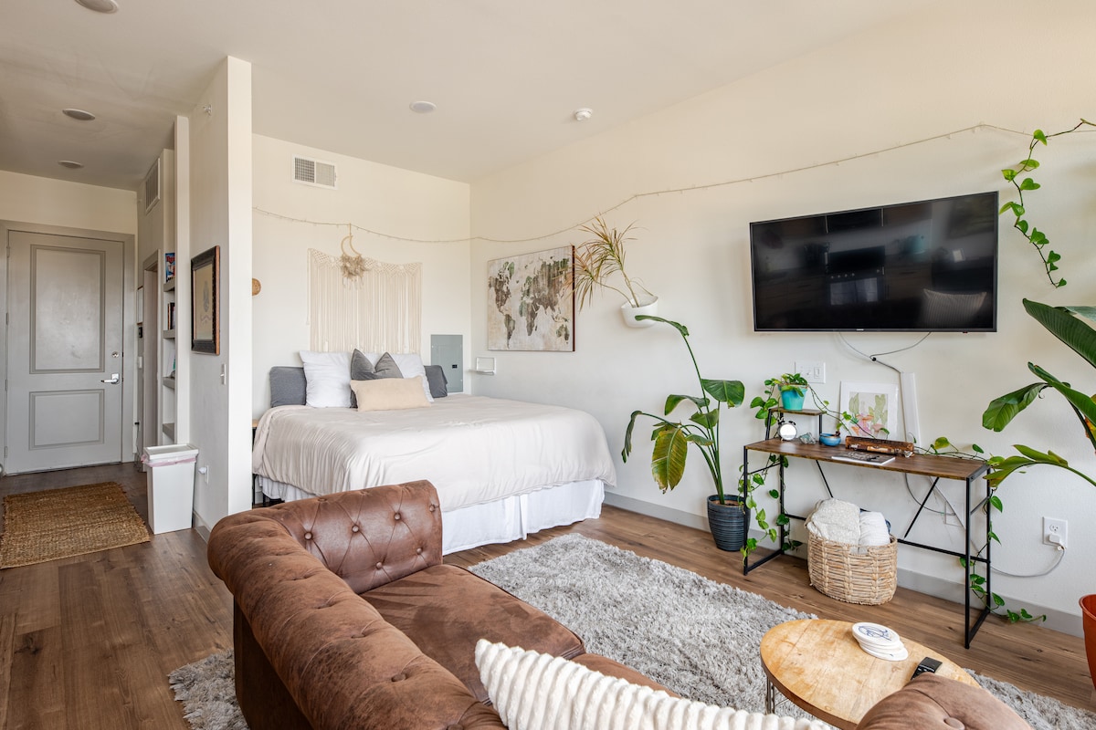 Relax in this super vibey, plant-filled studio with a private downtown view balcony and access to a 24/7 rooftop pool. Guests rave about the calming energy, greenery, décor, and peaceful atmosphere, perfect for unwinding or working. Centrally located and safe, this dog-friendly quiet retreat also features high-speed Wi-Fi and is ideal for solo travelers, couples, or business. With a host who goes above and beyond, experience the peaceful energy that makes this space unforgettable. Book now!