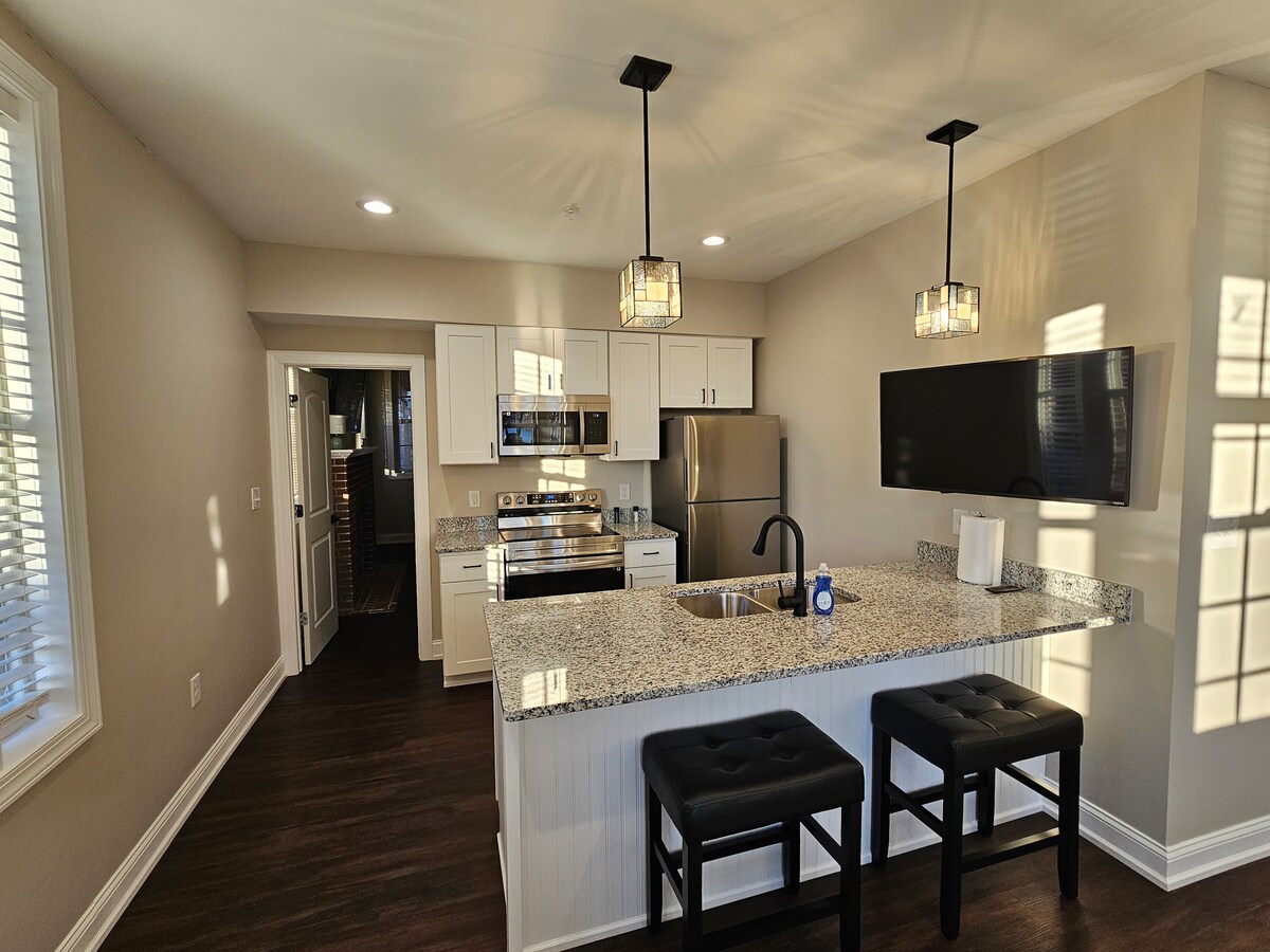 River views and easy access to everything from this perfectly located home base. The spacious unit offers guests a cozy yet expansive space in the heart of the city. The living area features ample seating facing a TV, ideal for relaxation. The kitchen is fully equipped for meal prep, and the bedroom offers a comfortable king size bed and 65" TV. One dedicated parking space is available for added convenience. Experience historic charm with modern amenities for a memorable stay in Harrisburg.