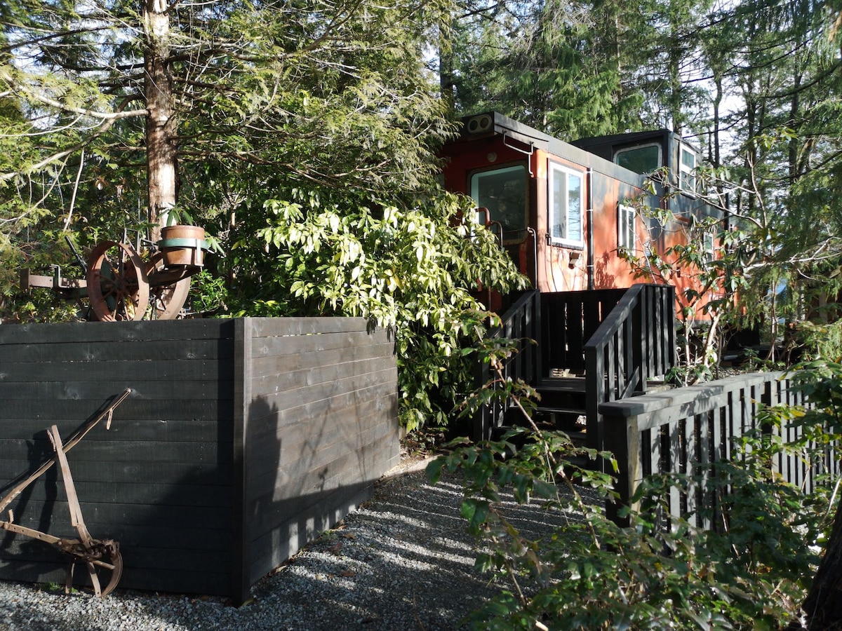 Perched up on the cliff, over-looking the Fraser River, our luxury train caboose is surrounded by a rhododendron forest. Conveniently located on highway #7, we are easily accessible and at the door step of endless outdoor adventures. We have our own private hiking trails that wind up the mountain side, crossing creeks, waterfalls and passing many varietals of rhododendrons amongst the lush, natural forest. There are multiple gazebos, look-outs and the higher up you go, the quieter it is.