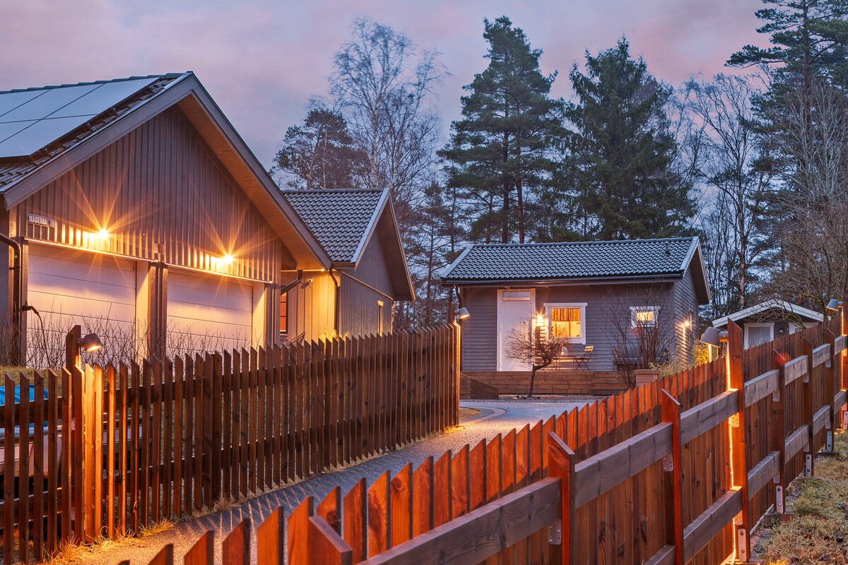 Villamini, built in 2021, is a 30 sqm guesthouse in a peaceful setting. Modern and stylish, designed for relaxation. Close to nature and lakes, yet only 12 minutes by car (outside rush hours) or about 30 minutes by bus to Gothenburg, Liseberg amusement park and the Swedish Exhibition & Congress Centre. Perfect for both a tranquil retreat and city life.