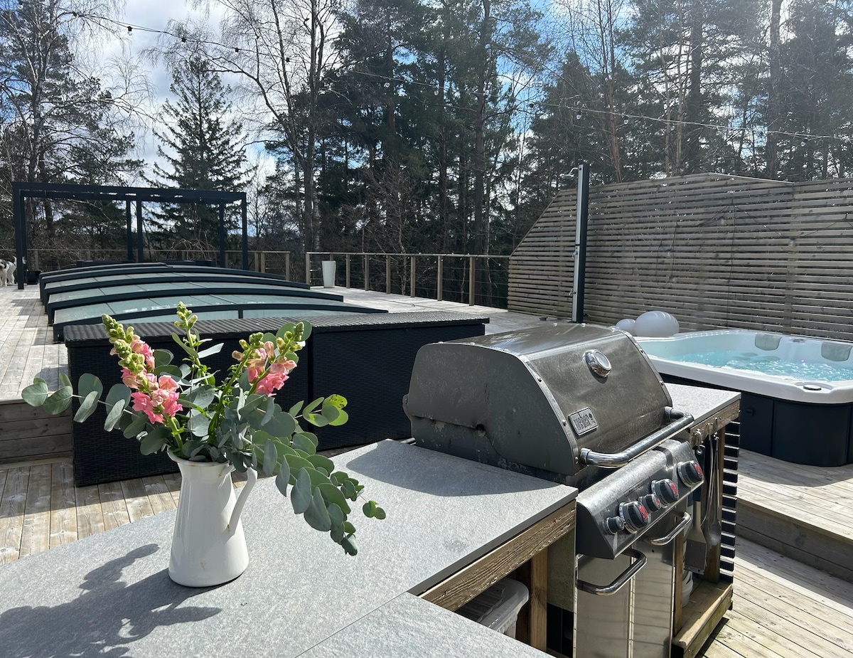 Relax in our cozy, new guesthouse in quiet Landvetter. Fits 4 with a kitchen and bathroom. Enjoy the heated pool in summer, or brave a winter dip. Grill available. Just 15 mins from Gothenburg's Liseberg amusement park and city center. Bus stop 200m away. Embrace tranquility with local wildlife and berry picking. Our location is surrounded by nature and lakes, it's quiet and peaceful. You might even spot an elk or find some blueberries to pick. Just relax and enjoy your stay.