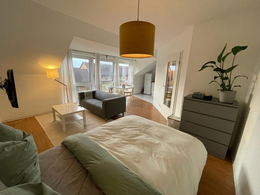 Herzlich willkommen in unserer liebevollen Studiowohnung mit zusätzlichen Schlafzimmer. Sie liegt im Dachgeschoss eines schönes Gebäudes von 1900 und hat einen eigene Eingang, durch den Ihr ungestört kommen und gehen könnt wann Ihr möchtet. Die Wohnung hat eine großzügige Küche und einen großen Wohnraum mit TV inkl. Netfixzugang. Auch wer einiges zu erledigen hat findet einen Schreibtsch mit LAN / WLAN. Außerdem habt ihr einen eigenen kleinen Gartenbereich mit Tisch und Stühlen.