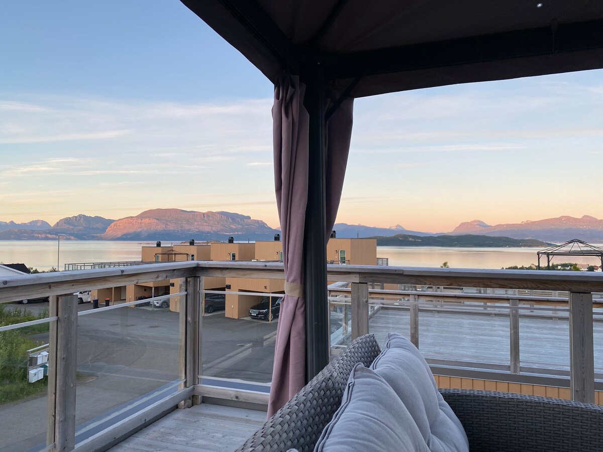 Make some memories at this unique and family-friendly place. Spend some time in private sauna or hot tube and enjoy the beautiful views and the silence of the mountain. During the summer ,the sun is just above and spinning around due to midnight sun exposure. During the winter time is everything white and good views and position to catch the northern lights. Is ideal for families with kids or small groups of friends . Breathtaking views over the shoreline of fjords and mountains upfront.