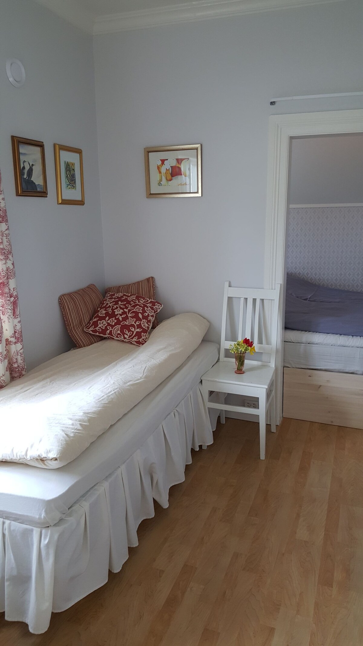 Soverom med 150cm bred seng. Stue med sofa 3+2 og kjøkkenbord med 2 stoler. Minikjøkken med kjøleskap i stua. Bad med dusj og toalett. Felles inngang med hoveddel av boligen. 1,5 km til sentrum, koselig tursti langs sjøen, gangavstand til Trondenes kirke og Trondenes historiske senter. Tilgang til hundegård hvis ønskelig.høyhastighetsbredband.Ekstra oppblåsbar seng og reiseseng for baby tilgjengelig.