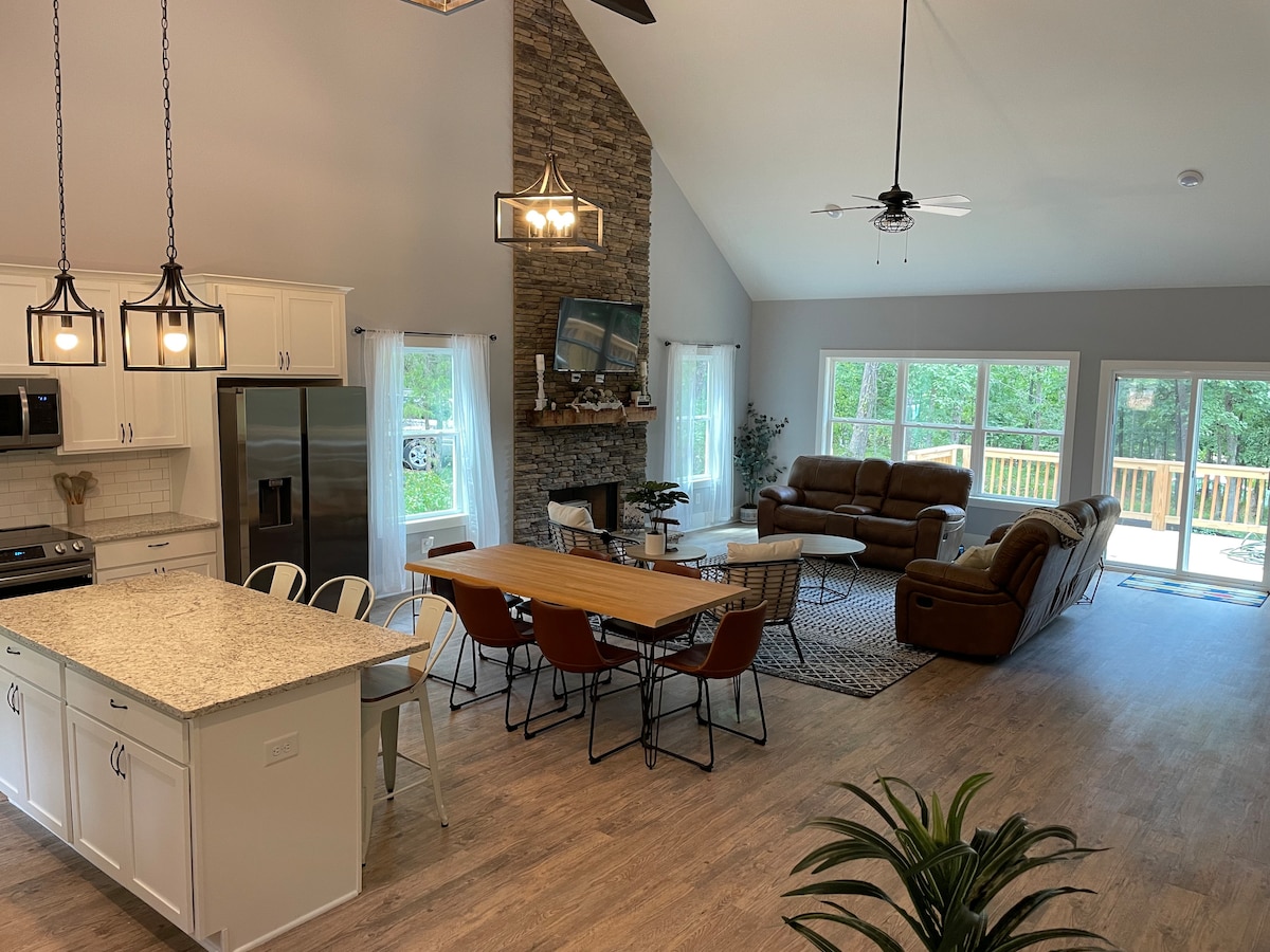 Ideal for a peaceful getaway or outdoor adventure! Newly built home on over 2 peaceful acres, gently sloping down to breathtaking lake views. Enjoy your own private covered dock—perfect for relaxing, fishing, or soaking in the tranquil surroundings Unwind by the fire pit, unforgettable backdrop for your evenings Inside, the home features two comfortable bedrooms and two full baths. The upstairs master suite includes a king bed, while the main-level bedroom offers a cozy queen bed EV Charger