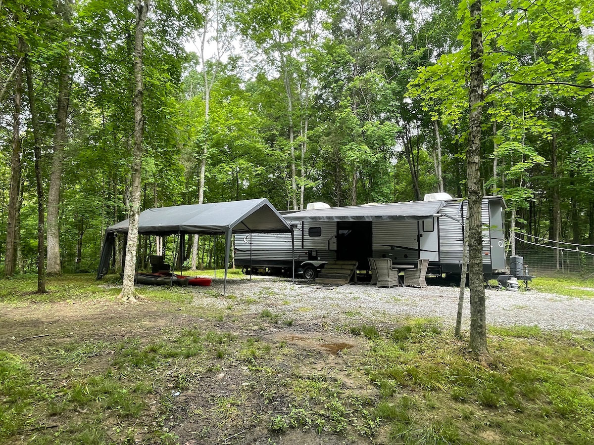 Mammoth Cave: 50 minute drive Boat Ramp/Swim: 6 minute WALK, or drive down Firepit: 20 PACES Grocery/Marina: 8 minute drive Hiking, biking, mountain biking, spelunking, offroading, horseback riding, boating , river kayaking, fishing, golf, restaurants: 30 minutes or less! Located in the coveted Green Acres Neighborhood on a peninsula of Nolin! Your Saltbox Cabin is nestled on a hillside acre overlooking the wooded gravel road that leads down to the lake.