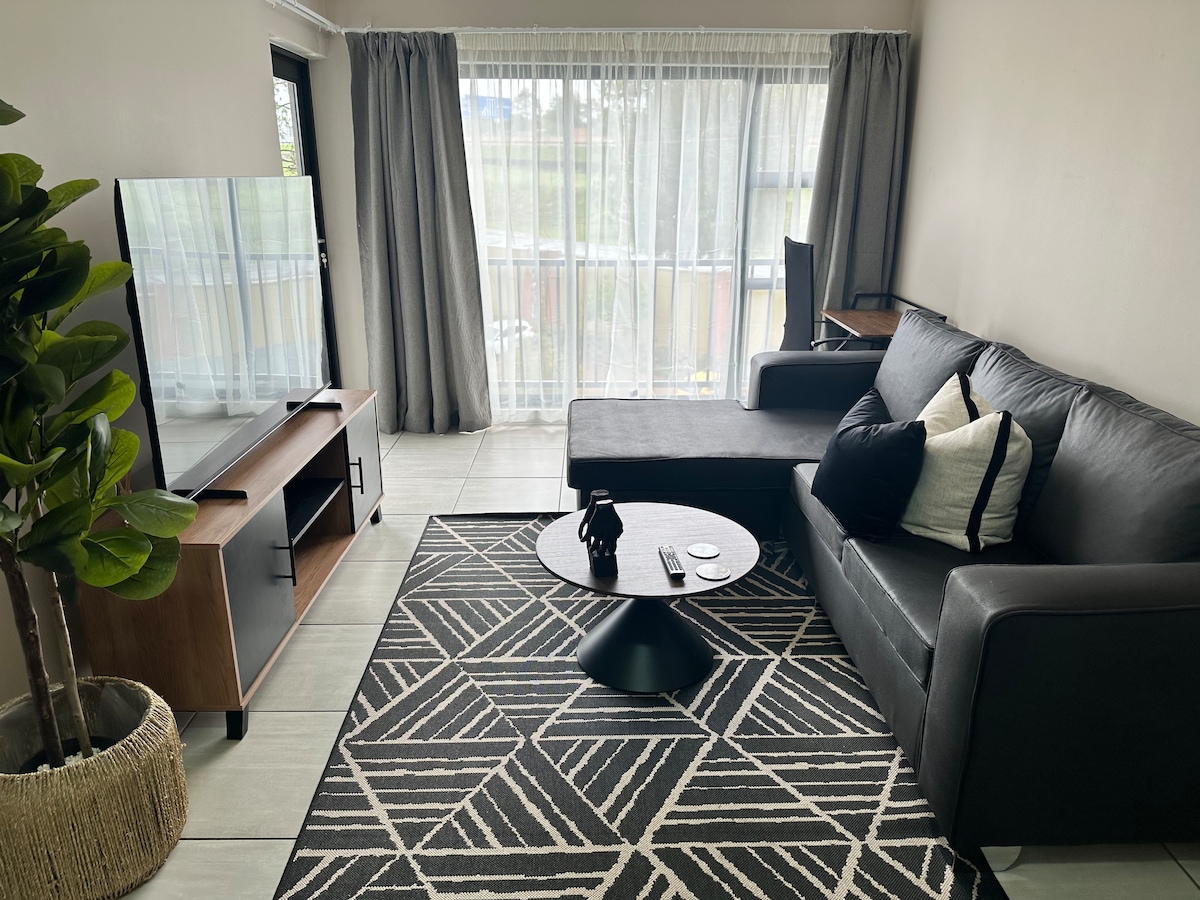 This unit can be made up as 2 single beds or 1 King sized bed to suit guest requirements. Please advise when booking? Situated between Midrand and Pretoria this location overlooks the Zwartkops Golf Course witheasy access to N1 and N14. 2.5km from the Gautrain Station and the Centurion Shopping Mall. There is an outside seating area available for use. WiFi and DSTV available. The unit has a kitchenette with microwave, kettle and toaster. Work space provided.
