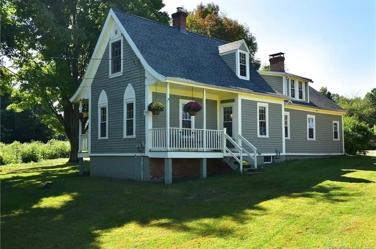 A cozy getaway for couples, nomad workers, families, pets, bikers, hikers... all love our 750 sf cabin with pond and huge yard. Full kitchen, large balcony-deck, fire pit, pond, and parking for 4 cars. The "Hop River Trail" is just steps from our driveway. Walk a 1/2 mile to a lovely meandering waterfall, or walk for miles if you love a good hike. Just 15-min drive to Manchester, Vernon, UCONN Storrs; only 30-min to Hartford, casinos, airports. (Pls declare pets under "Guests".)
