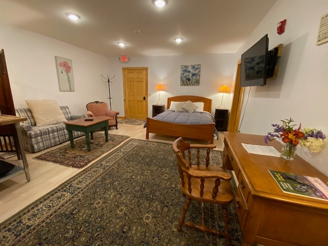 A Vermont getaway in this spacious guest suite located downstairs of the event barn with private yoga studio. The suite has a hardwood, VT crafted, queen size bed, decent size kitchenette, TV, couch area, sitting desk & yoga props for your relaxing pleasure. Sleep in, take your time, no rush. Enjoy the grounds & sip coffee in the gardens. Revitalize & restore in a quintessential Vermont town surrounded by green mountains & silver lakes. This suite is a basement studio down flight of stairs.