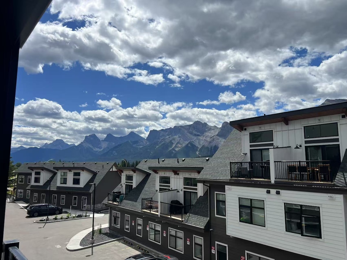 Relax on the private balcony with a cup of coffee as you watch the sunrise over the mountains. And only 1 min away from the Banff National Park gate! This vacation home can accommodate up to 7 adults and 1 kid. - SUPER comfy beds - 100+ TV Channels - In suite Laundry - WIFI - A private balcony with gorgeous mountain views - A gas fireplace - A spacious fully equipped kitchen - Air Conditioners - A huge backyard with BBQ grills(Shared) - Plenty of free onsite parking