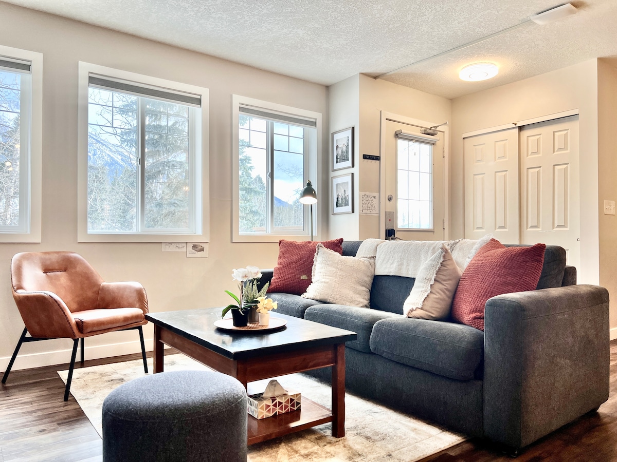 Blue Moose is a newly updated and furnished, spacious luxury one-bedroom condominium with king -sized bed and queen sofa bed. New for 2025: major bathroom and kitchen upgrades. PERFECT LOCATION This modern mountain retreat is situated next to a pristine mountain creek. Follow a creekside nature trail and within minutes you are in downtown Canmore with trendy shops, cafes, food trucks, and both casual and upscale dining.