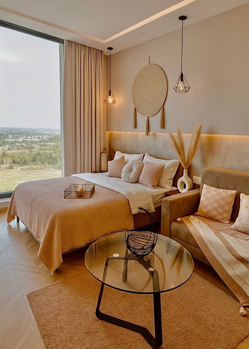 Our newly constructed 2 BHK apartment blends modern comfort with natural charm. The space features 2 serene bedroom with a queen-size beds, a spacious living room, a well equipped kitchen, 2 bathrooms: one attached to the master bedroom and another accessible from the living room and second bedroom and L- shaped balcony offering great view of the city. The property is located near a premium mall in Noida! This well-situated location offers you the convenience of shops, cafes, and entertainment.