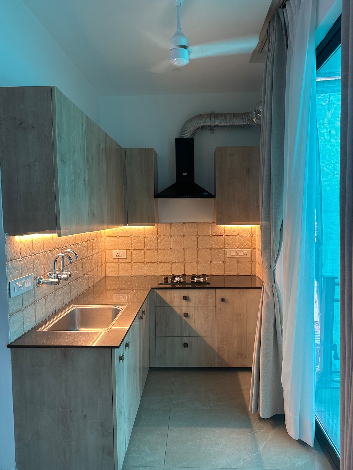 ➽ Spacious 1BHK apartment with an attached patio, fully air-conditioned. All rooms have 1.5-ton ACs. ➽ Sun-facing property in a high-income neighborhood, three-side open, park-facing, and well-ventilated with ample natural light and fresh air. ➽ High-end projector with 25W soundbar and Amazon FireStick with OTT apps. ➽ Fully equipped kitchen with essentials for convenient cooking. ➽ Relax on the stunning private terrace patio with ambient lights and unique Foger system for cooling the patio