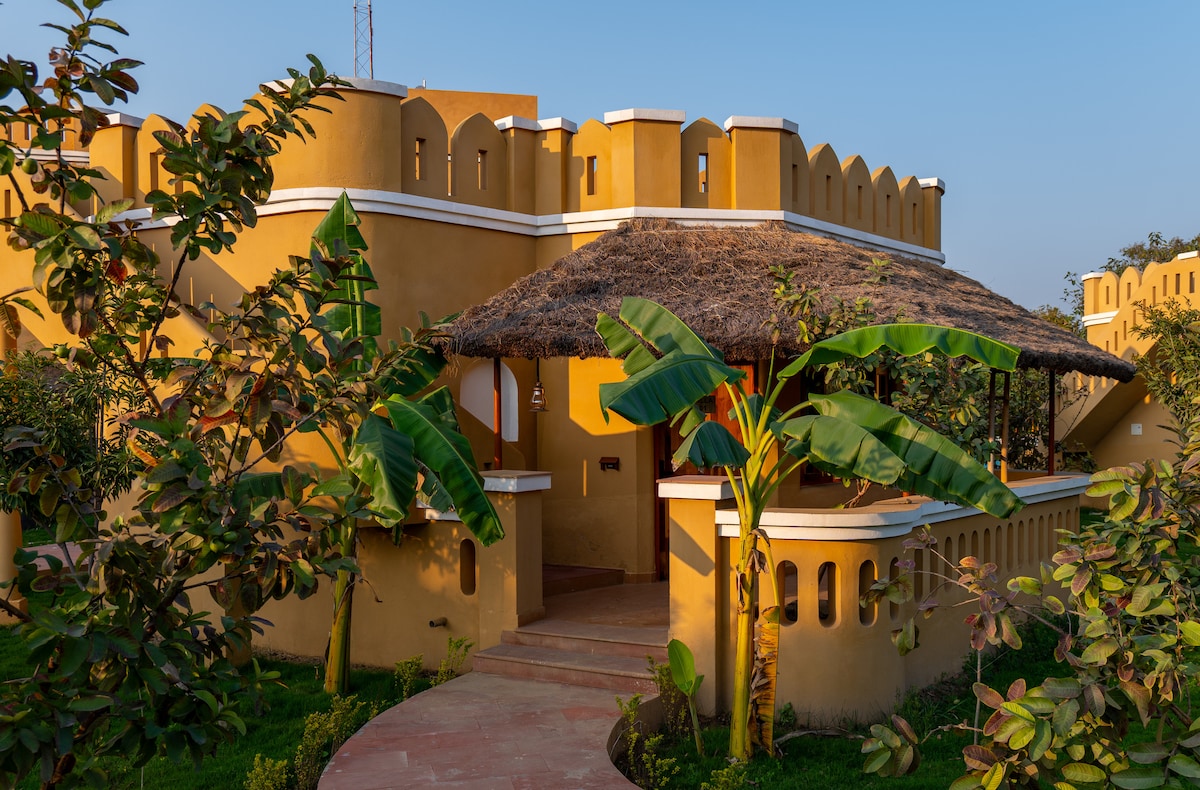 Nestled in a forest‑surrounded 12‑acre resort — a rustic‑Mediterranean suite awaits amidst fruit‑and‑vegetable gardens, offering peaceful reprieve. Relax in a cosy 322 sq.ft. cottage‑style room with a king‑size bed, wooden accents, soft lighting, private patio, and a terrace with serene views. Enjoy poolside lounging, two expansive gardens each of 1-acre apporx, a tree‑house machan, and Tuscan‑style dining. Ideal for families, couples.