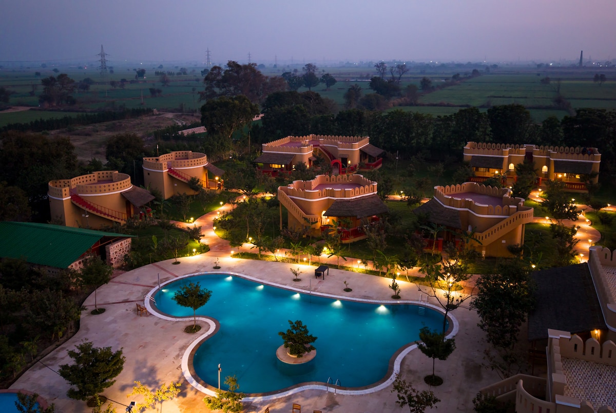 Nestled in a forest‑surrounded 12‑acre resort — a rustic‑Mediterranean suite awaits amidst fruit‑and‑vegetable gardens, offering peaceful reprieve. Relax in a cozy 322 sq.ft. cottage‑style room with a king‑size bed, wooden accents, soft lighting, private patio, and a terrace with serene views. Enjoy poolside lounging, two expansive gardens each of 1-acre approx., a tree‑house machan, and Tuscan‑style dining. Ideal for families, couples.
