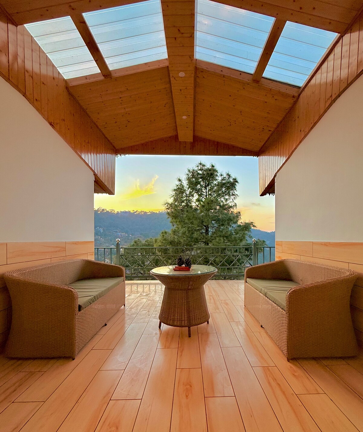 Surrounded by pine-covered slopes, this villa is designed for those who find joy in quiet luxury and thoughtful details! Beneath a sloped ceiling with exposed wooden beams, the indoor bar area is ideal for leisurely evenings with its dark wood counter, cushioned black stools, vibrant sofa and AC for added comfort. The spacious terrace offers breathtaking 360° hill views, bordered by colorful flowers, while the lounge den features an L-shaped sofa and a uniquely shaped wooden coffee table.