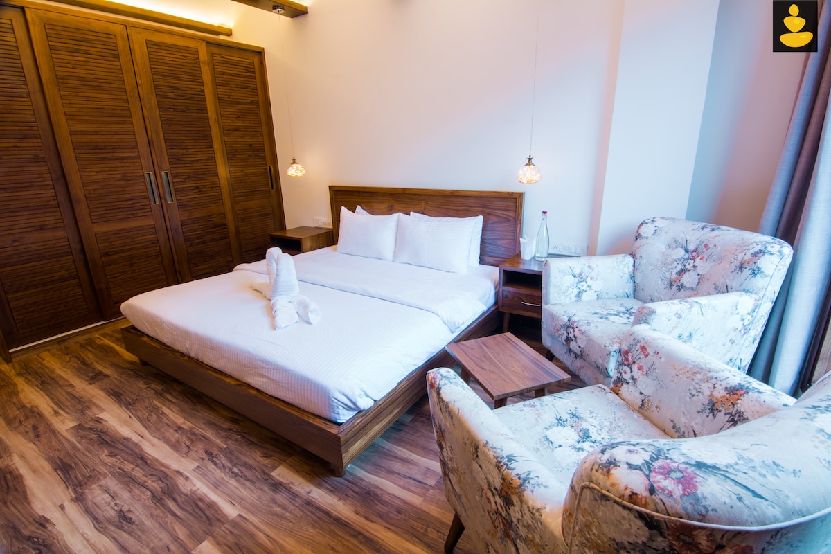 Nestled in a forest‑surrounded 12‑acre resort — a rustic‑Mediterranean suite awaits amidst fruit‑and‑vegetable gardens, offering peaceful reprieve. Relax in a cosy 322 sq.ft. cottage‑style room with a king‑size bed, wooden accents, soft lighting, private patio, and a terrace with serene views. Enjoy poolside lounging, two expansive gardens each of 1-acre apporx, a tree‑house machan, and Tuscan‑style dining. Ideal for families, couples.