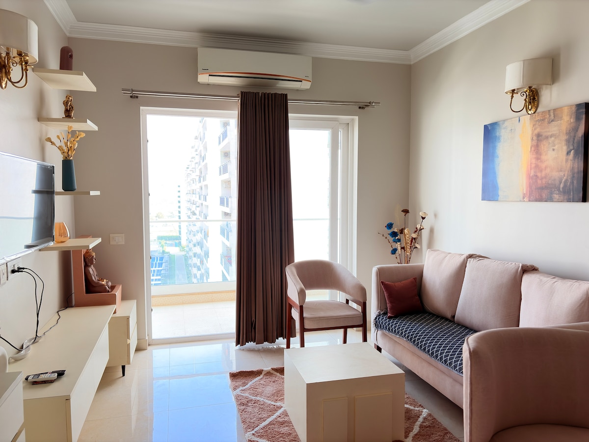 Modern 1BHK in Central Park Flower Valley. Sunlight fills the bedroom with a king bed and calm interiors. The balcony is a little wild, making it perfect for fresh air, chai, or a smoke under open sky. Kitchen is fully set for basic cooking. Smart TV, Wi-Fi , AC + inverter backup keep you comfortable. Great for business trips, short stays or slow weekends. A peaceful pocket of soft luxury in Gurugram. Soft daylight in every corner feels designed to breathe with a beautiful Aesthetic pool View.